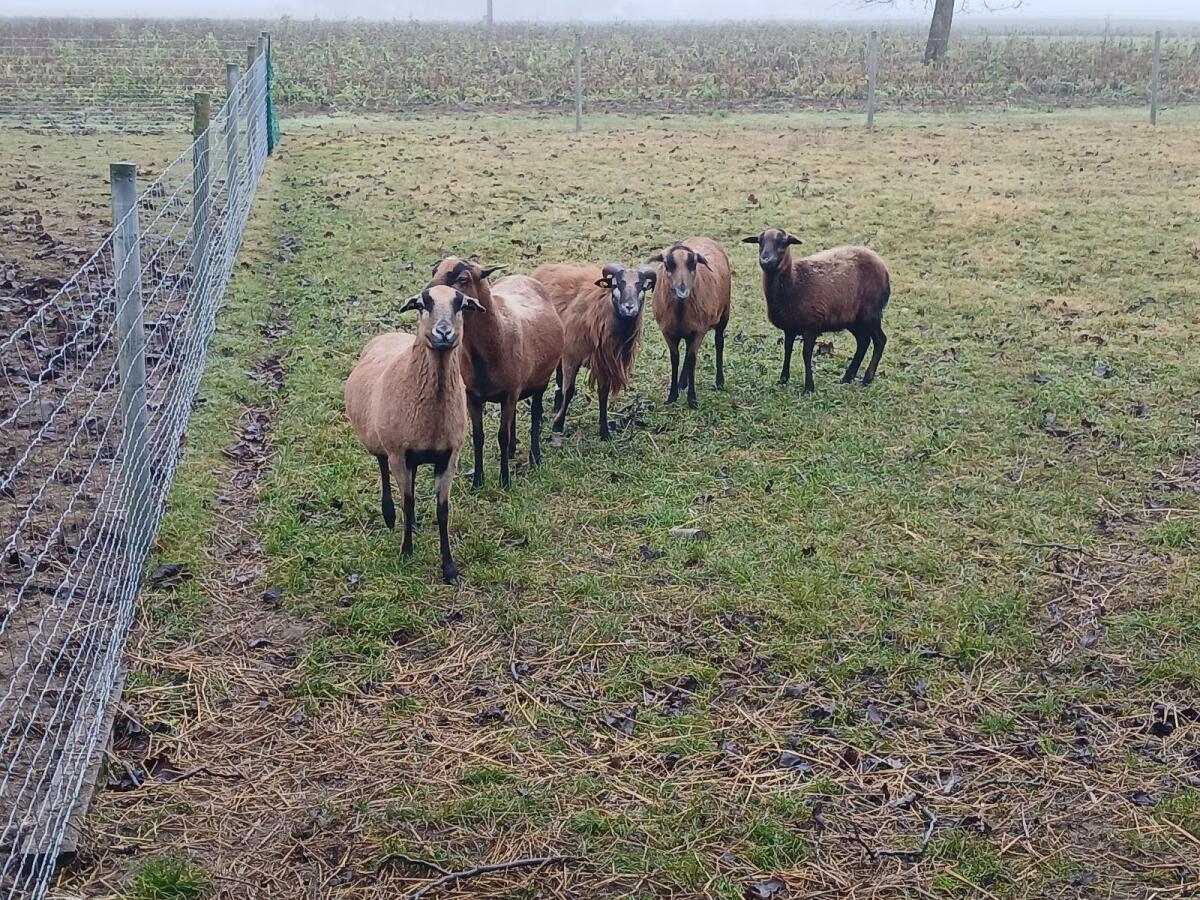 Wegen Umstieg auf Rinder geben wir die Kamerunschafe meines Opas ab. Es handelt sich um eine kleine Herde mit 5 erwachsenen Tieren, 1 Bock und 4 Mutterschafe, alle s