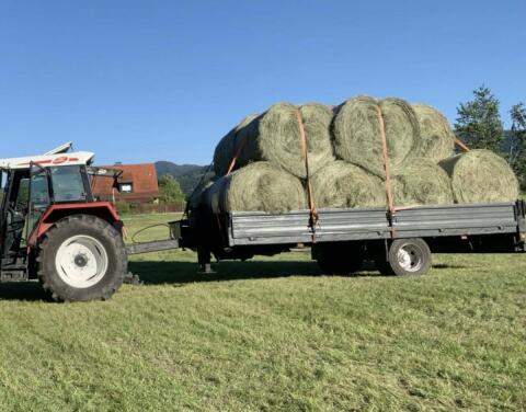 2-Achs Plateauanhänger, 9 m Plateaulänge, Krone, Bj. 2005, luftgefedert, 12 V Lichtanlage, Plateau mit starken wasserfesten Platten, Ballengitter. Priklopniki Drugi