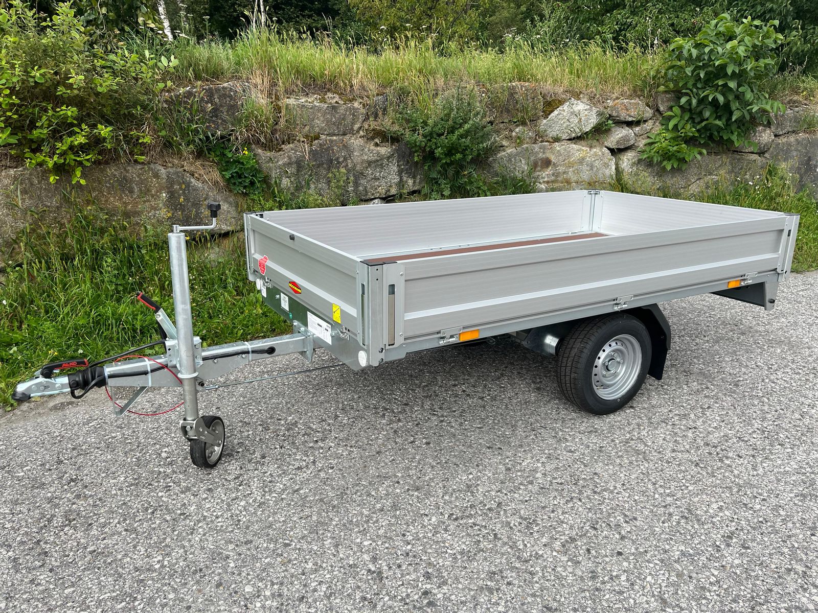 Hochlader HL-AL 2514/135 Innenmaße : 2560,00x1400,00x300,00 mm Zulässiges Gesamtgewicht 1350kg Nutzlast: ca. 1100kg Einachs-Modell Bereifung: 185/60 R 12 C Felge: 5 1/2 J x 12 ET 30 Bordwände in Alu, elox., mit Langwegverschlüssen Bordwände abnehmbar (also Plateauanhänger verwendbar) 4 Stück Zurrbügel in Seitenblende +Stützrad automatik +Fahrzeugpapiere