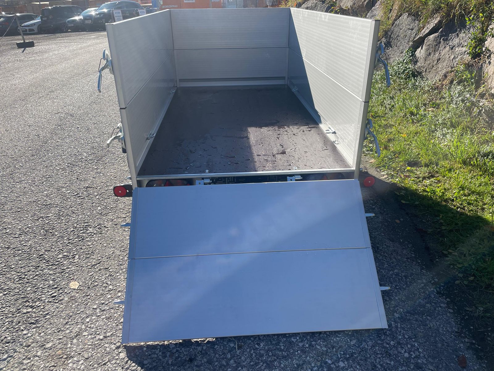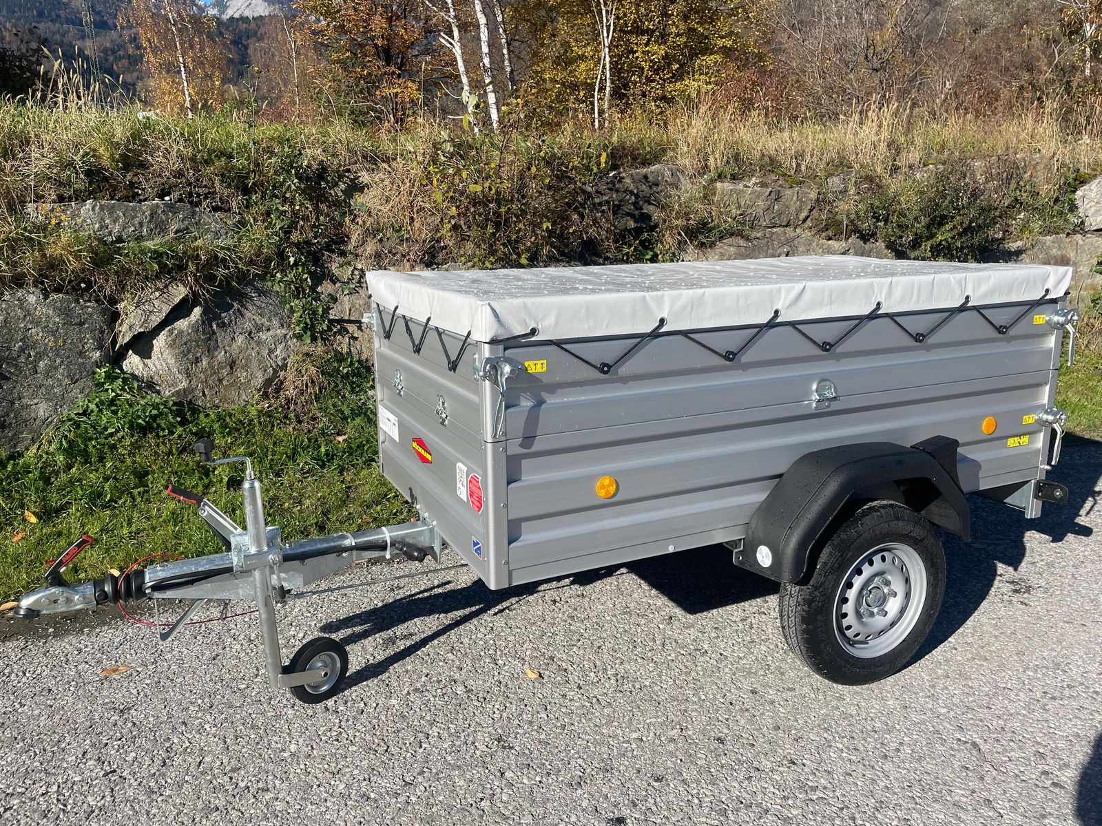 Tieflader PKW-Anhänger TL-AL 2111/10 Innenmaße: 2100,00x1110,00x700,00 mm Zulässiges Gesamtgewicht: 1000kg Nutzlast: 812kg Ladehöhe: 506mm 1 Querträger Einachs-Modell Bereifung: 155/80 R 13 Felge : 4 1/2 Jx 13 ET 30 Bordwände Alu-eloxiert Stirnwand fest Kastenaufsatz abnehmbar 4 Zurrösen mit Nutensteinen montiert, verstellbar +Kastenaufsatz Alu 350mm +Flachplane, Planenfarbe grau +Aufpreis Stützrad automatik (nicht am Bild) +Fahrzeugpapiere