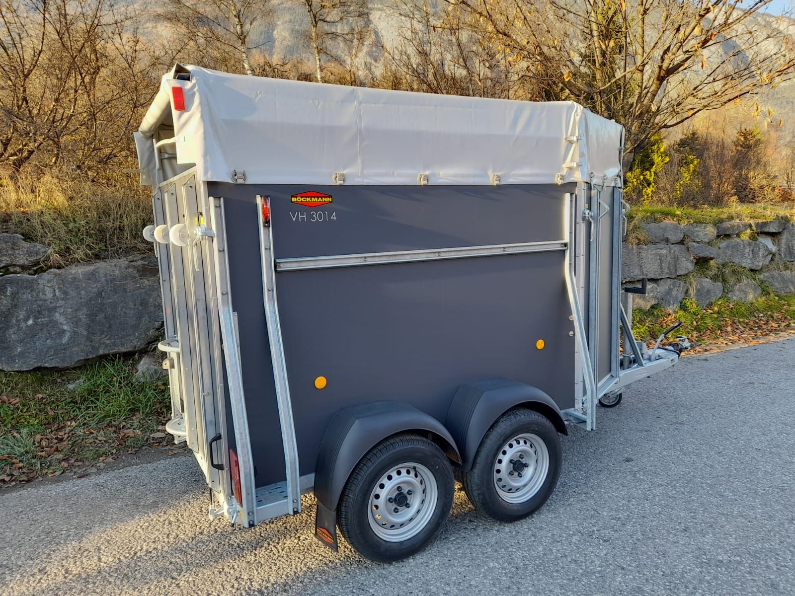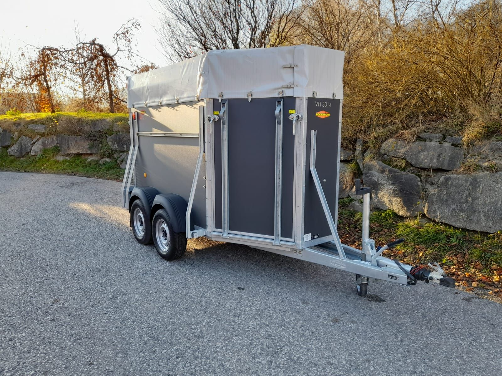 Viehanhänger VH 3014/24 (Plywood Aufbau) +Hinterklappe/1-Flügeltür (links angeschlagen) +Entladeklappe rechts mit Gummibelag (Einstiegstür: links) Innenmaße: 3050,00x1450,00x2030,00 mm Zulässiges Gesamtgewicht 2400kg Nutzlast: ca. 1560kg Siebdruckboden 3 Seitenstreben, 3 Hinterklappenscharniere Grauer Plywood-Aufbau, 1500 mm hoch Rollen an Hinterklappe Querversteifung der Seitenwände mit M-Profil Gummiboden verklebt und versiegelt Hebevorrichtung Gasdruckstoßdämpfer Gummi auf Hinterklappe (integrierte Trittleisten) PVC-Plane und Spriegel 3 Anbinderinge Boxenstange durchgehend (herausnehmbar) vor Hinterklappe Planenfarbe grau Stützrad automatik Innenbeleuchtung Fahrzeugpapiere
