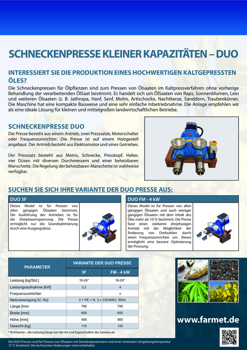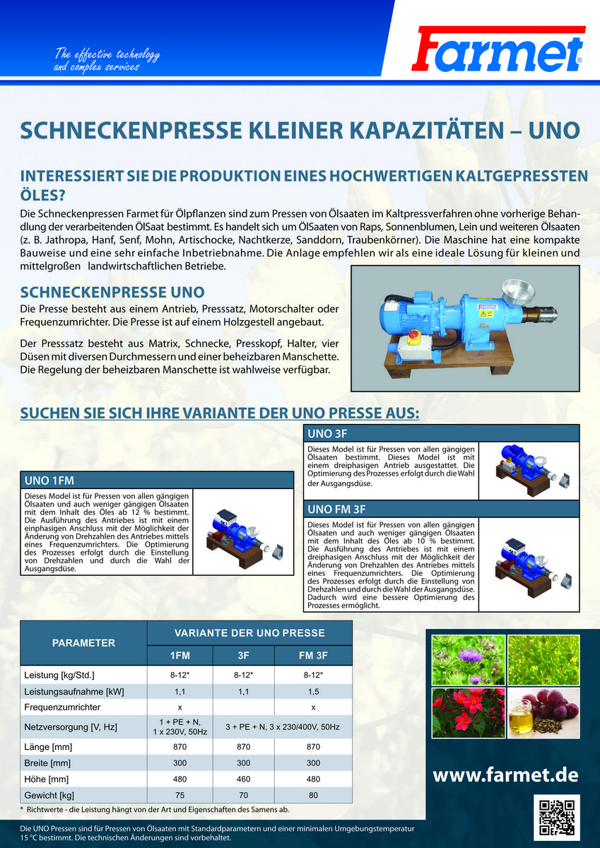 Ölpresse der Firma Farmet Typ UNO 1FM – Messemaschine, unbenutzt Zum Verkauf steht eine Ölpresse UNO 1FM aus Messebestand. Die Maschine ist unbenutzt und in einwandfreiem Zustand. Dieses Modell eignet sich zum Pressen aller gängigen sowie weniger gängigen Ölsaaten mit einem Ölgehalt ab 12 %. Die Optimierung des Pressprozesses erfolgt durch: # individuelle Einstellung der Drehzahl # Auswahl der passenden Ausgangsdüse Technische Daten: # Leistung: 8–12 kg/Std. # Antriebsleistung: 1,1 kW # Frequenzumrichter: ja # Netzversorgung:1 + PE + N, 1 × 230 V, 50 Hz # Abmessungen (L×BxH): 870 × 300 × 480 mm # Gewicht: 75 kg Highlights: # Messemaschine, unbenutzt # für viele Ölfrüchte geeignet # kompakte Bauform # einphasiger Anschluss # flexible Prozesssteuerung # inkl. Holzgestell Ideal für Landwirtschaft, Direktvermarkter oder kleinere Produktionsbetriebe.