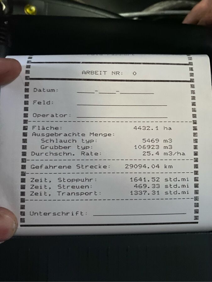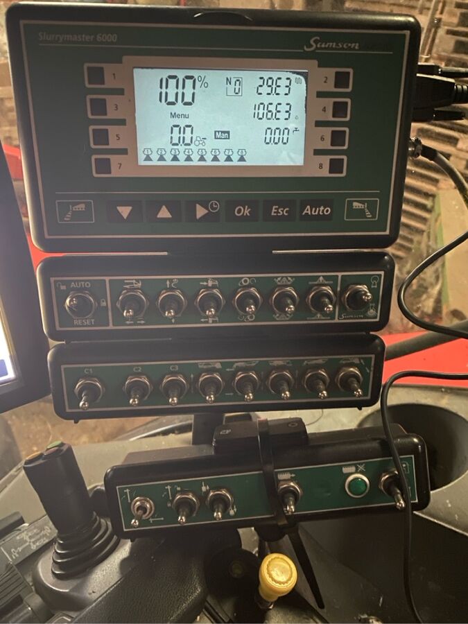 Laufleistung: ca. 115.000 m³ Samson PG 18 Güllewagen; 2 Achsen, hydraulisch gefedert, Standard Lenkung über Nachlaufachse hinten; Tank von aussen lackiert und von innen mit epoxy behandelt. Grundausstattung mit Samson Bordcomputer Slurry Master 6000, Durchflussmengenregler über Fahrgeschwindigkeit, Samson Kreiselpumpe zur Ausbringung inklusive Fremdkörper Mulde, elektrohydraulischer Steuerung des gesamten Wagens, hydraulischer Kugelhahn für Rührfunktion, Sektionsentleerung, Inspektionsdeckel, Befülltrichter, Stützfuß, seitlichem Blindflansch, Elektronische Befüllanzeige, weitwinkel Gelenkwelle, Halterung für Schleppschlauchgestänge, gesetzliche Beleuchtung, Arbeitsbeleuchtung (2 Stck. Xenon + 1 oder 2 Stck. Scheinwerfer + 1 Rundumleuchten), 15L Wassertank, Werkzeugkasten, Luftbremse mit 406x140mm Bremsen und K 80 Kugelzug Kupplung. (Serienausrüstung) + Alliance 750/60 - 30,5. Radial type 390 + Ejektor inkl. Andockarm mit Pumpe (LS-Steuerung notwendig, Zurückhalten einschl.)+ 3-Punktlift Kat. 3 mit Unt. - Oberlenker und Elektr. Bedienung, doppeltwirkend inkl. Aktive Heckhydraulik + LS-Steuerung für elektr. Hydraulik + Vorbereitung für Schleppschlauch-Gestänge mit Sektionsverteiler + Vorbereitung für TD8 Grünlandschlitzgerät + Gewichtsübertragung (Top Zylinder) + Zentralschmieranlage Lincoln (werkseitig montiert), einschl. Pumpenstation ohne Kotte Verteiler. Laufleistung: ca. 115.000 m³