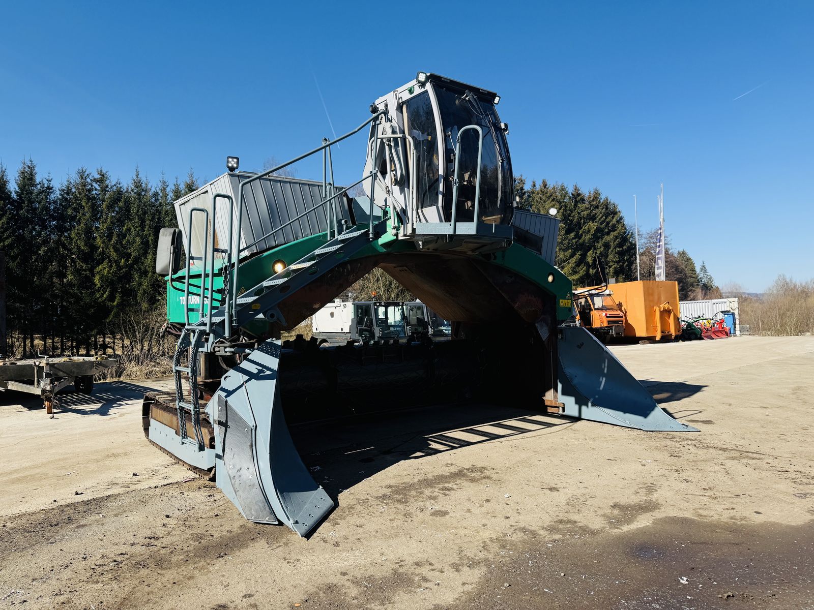 Kompostwender Komptech Topturn X53, Erstbesitz aus österreichischen Staatsbetrieb, Baujahr 2005, Arbeitsbreite 5 m, Kettenlaufwerk, Schutzbelüftung, vollständige Ausrüstung für Seitenversetzer, Klima, zusätzliche Stiege für einfachen Aufstieg, Motor CAT C9 DPF, Nachgerüstet für eine bessere Abgasstufe, LED Arbeitsbeleuchtung, Motorhaube per Elektroaggregat zum Öffnen, Kabine vollständig hydraulisch am Boden zu senken, für bequemes einsteigen, Maschine hat ein großes Service bekommen (sämtliche Öle sowie Filter), dabei wurden auch fast alle Hydraulikschläuche gewechselt, Laufwerk vor wenigen Stunden neu (alle Laufrollen und Kettenbänder), Walze wurde ebenfalls vor weinigen Stunden aufgepanzert und ausgewuchtet (aktuell ~ 80%), Polyamid Verschleißplatten neu, sämtliche abgenutzte Teile wurden sandgestrahlt und neu beschichtet, dabei wurden auch mangelnde Bolzen ausgetauscht, Steuerplatiene NEU, weiters wurde die Maschine von einem Komptech Techniker durchgecheckt, sämtliche Ersatzteillisten sowie Hydraulik u. Elektroschaltpläne vorhanden. Auf Wunsch haben wir noch den passenden Umsetzer dazu. Transport sowie Einschulung europaweit möglich!!!
