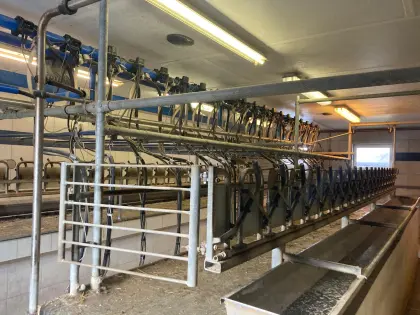 Diese komplette Rohrmelkanlage wird aufgrund einer Betriebsauflösung verkauft. Swing-Over Ziegenmelkstand hat 40 Plätze und 20 Melkzeuge. Gebrauchter, aber funktions