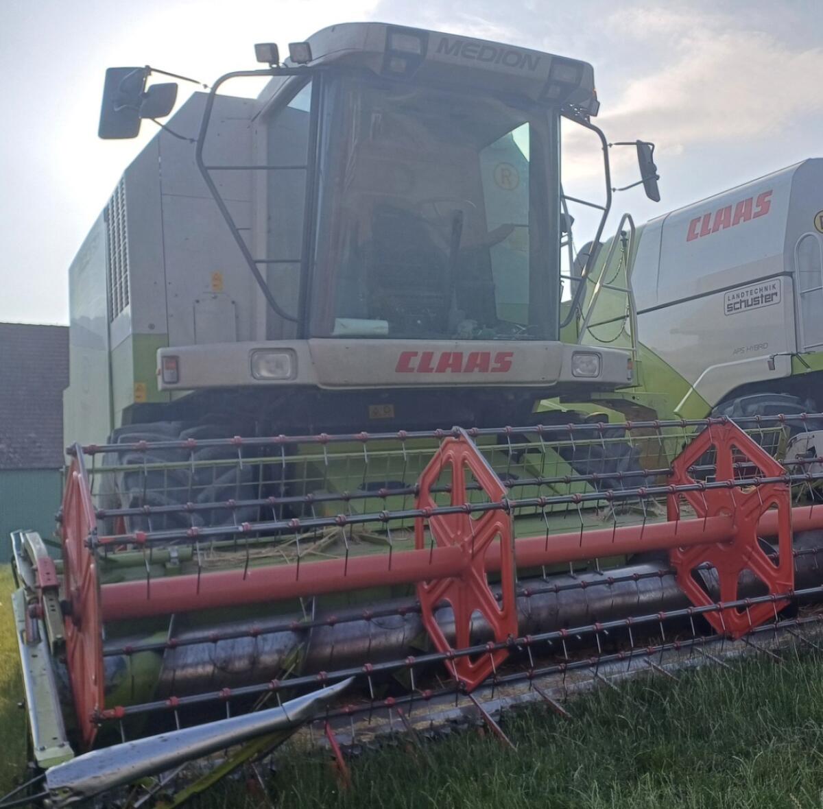 Gebrauchter Medion 310, Werkstatt überprüft und alle Wartungen durchgeführt, Fahrersitz und Lenkradverstellung, Rückspiegel manuell einstellbar, Klimaautomatik inkl. Kühlfach, Bordinformator, Korntank 5.800 l, Dreschkorb universal Draht, Dreschtrommel 2 Stufenregeltrieb, Strohhäcksler, Lamellensiebe Standard, Bereifung 650/75 R32, 14.9/80-24, gebrauchtes Claas Schneidwerk C420, Halmteiler klappbar, Schneidwerkwagen.