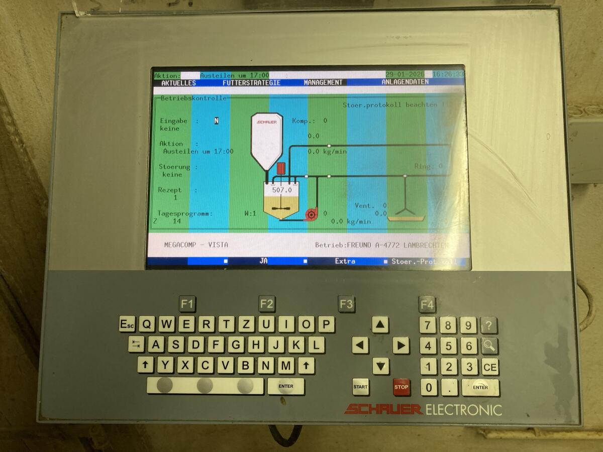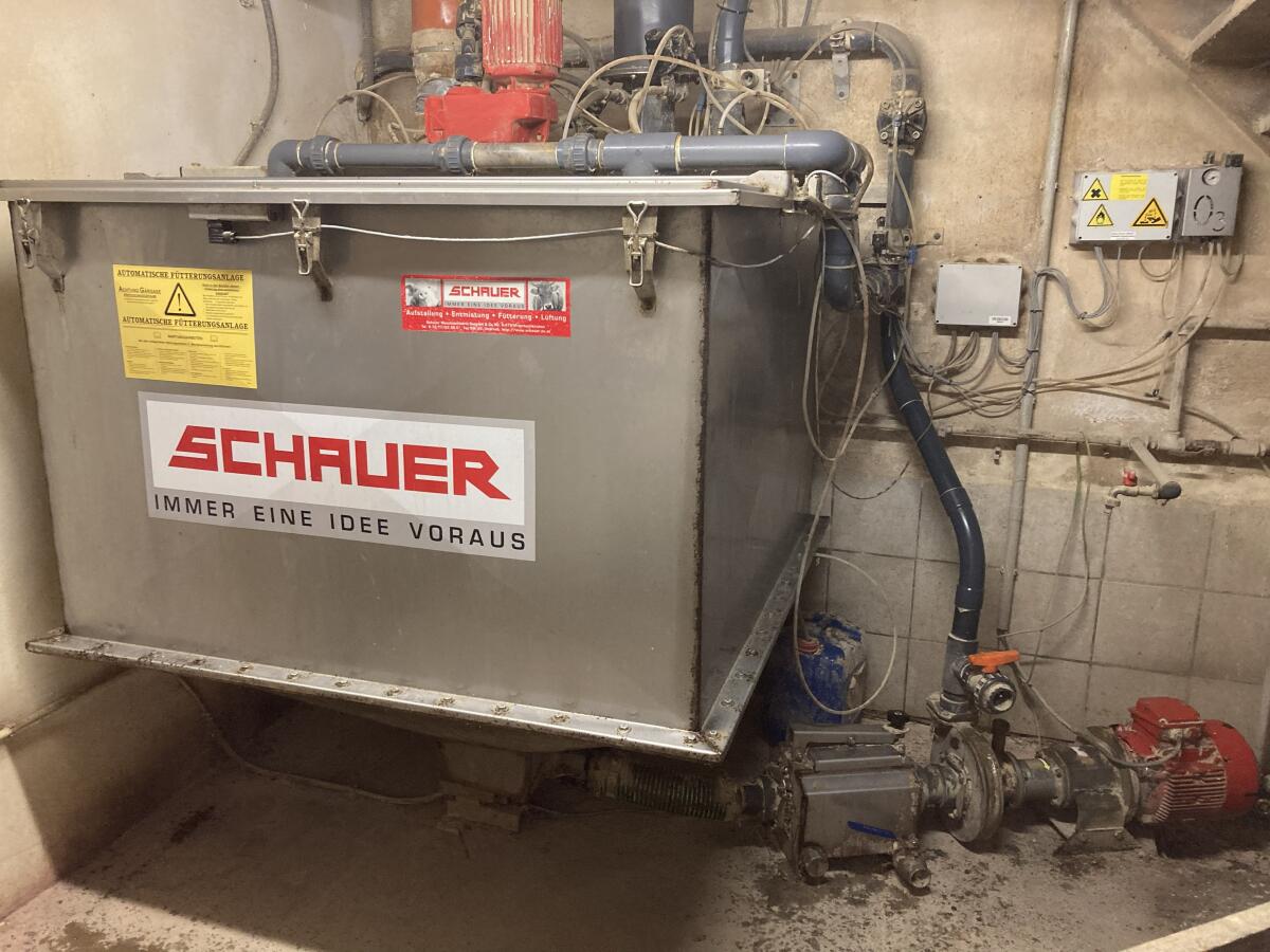 Schauer Flüssigfütterung el.pneumatisch, Behälter für 1.400 l, inkl. Rührwerk, steht auf der Wiegezelle, 31 Ventile, Bj. 2005, mit Computer, Schaltschrank, Säurenebler, Ozon Anlage, Fremdstoffe Abscheider, wegen Fütterungsanlagen Umstellung.