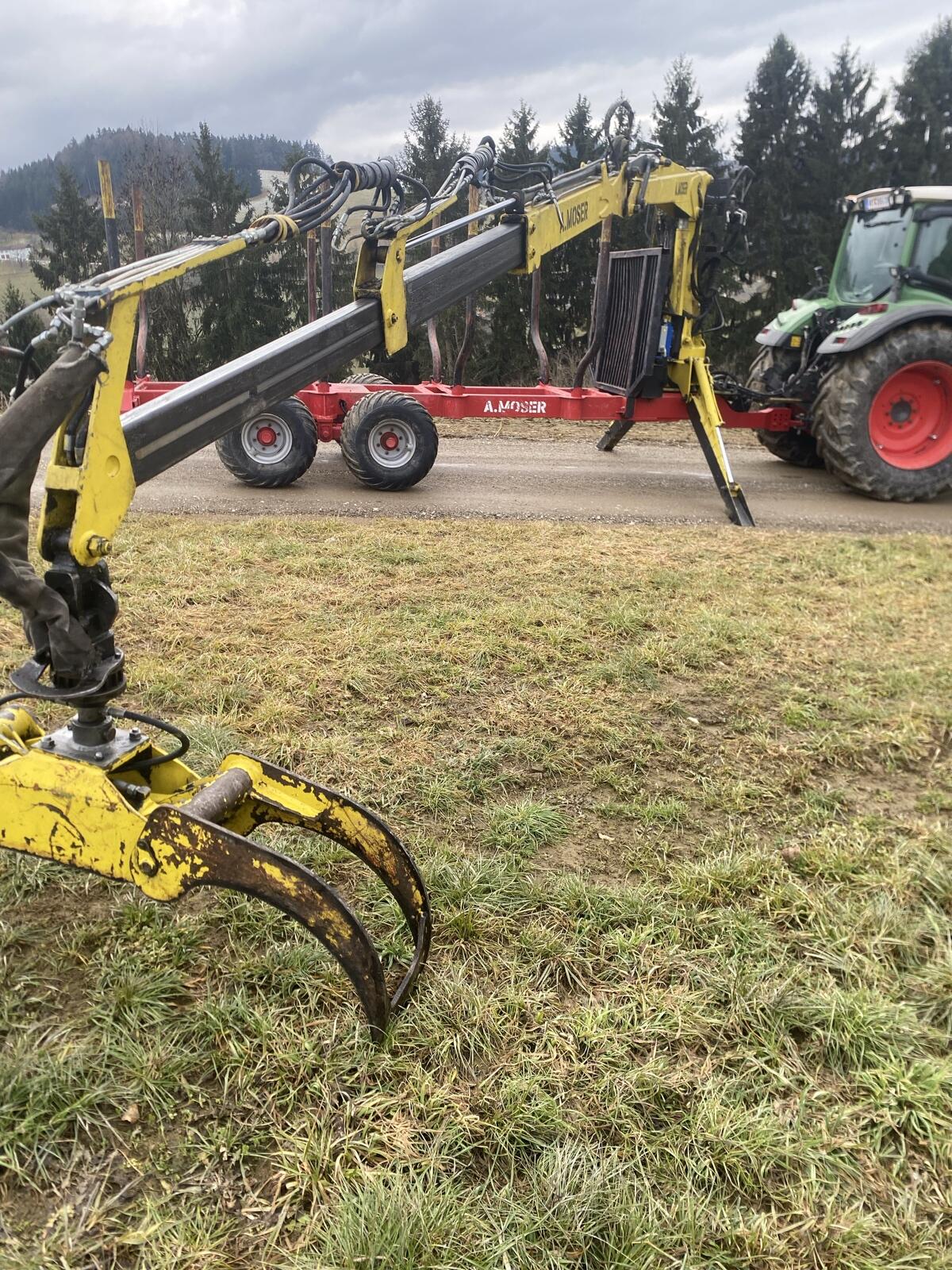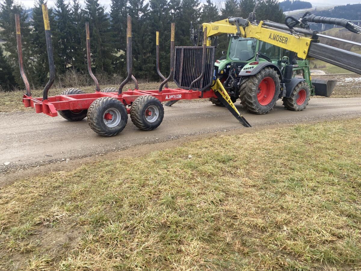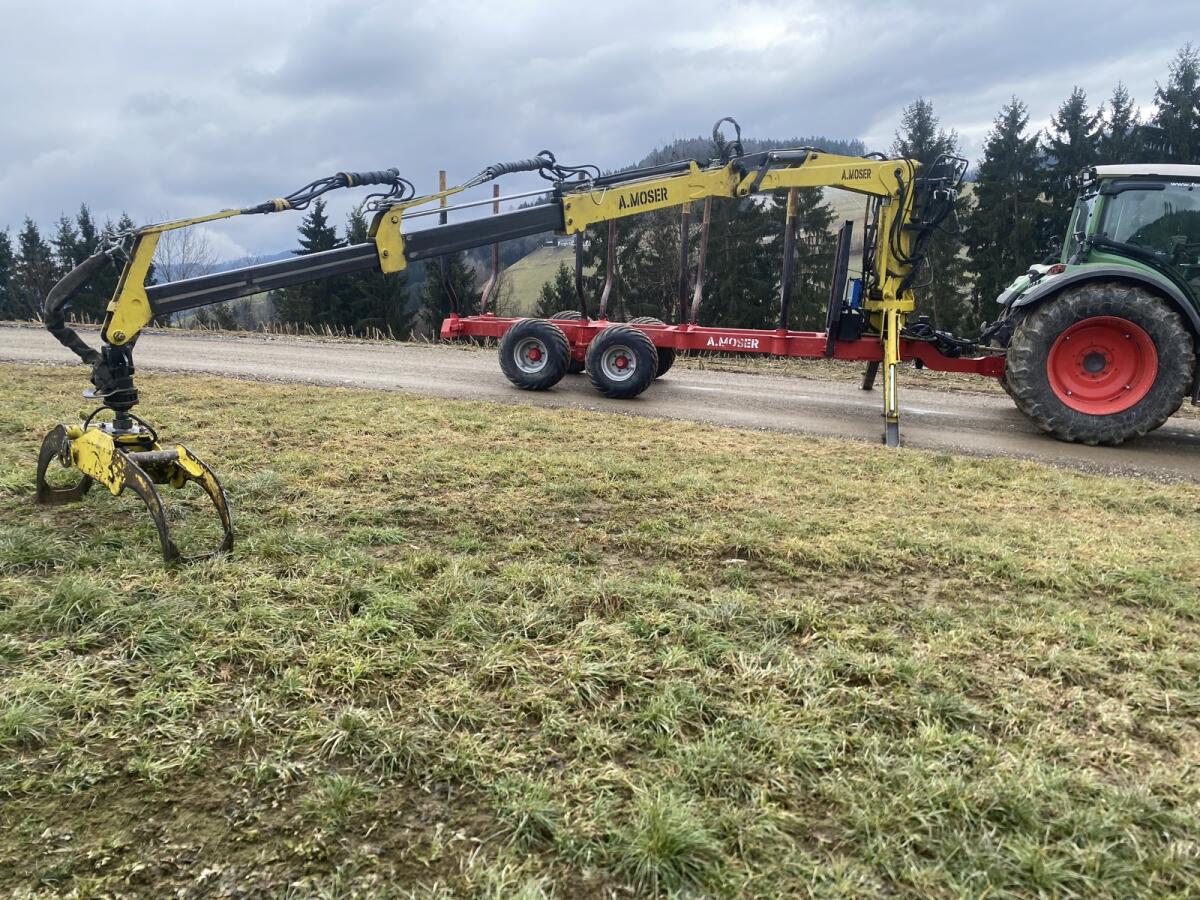 Verkaufe meinen gut gebrauchten A. Moser Forstanhänger wegen Umstieg auf einen größeren. Hat einen 8,50 m Kran mit Eigenöl und Hochsitz, 2 Achsen hydr. gebremst, mit ausziehbarem Doppelrahmen, Lichter abnehmbar. Reifen und Ölkühler ca. vor einem Jahr erneuert.