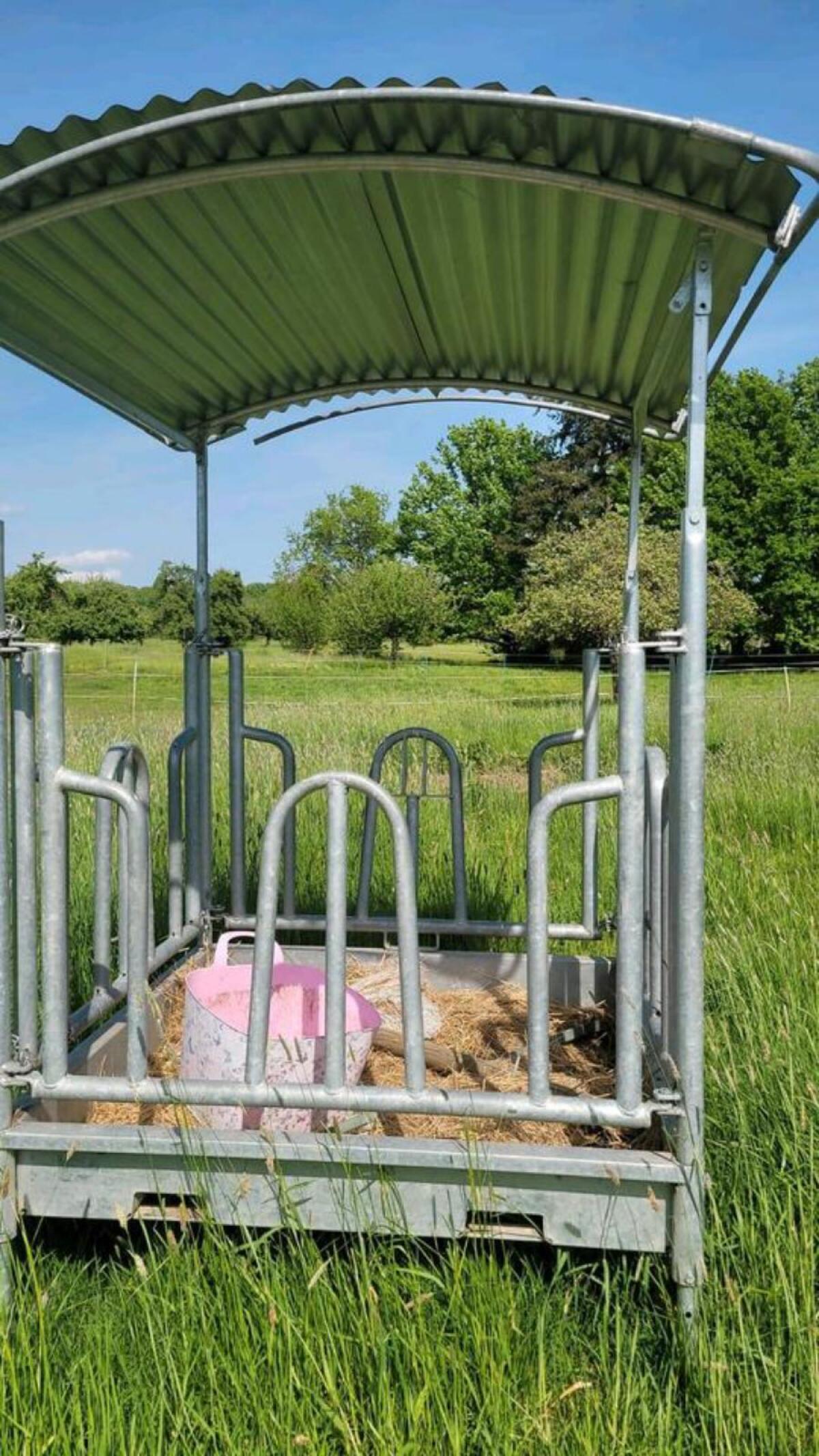 Hallo ich verkaufe unsere Heuraufe mir Kufen und Rädern, somit ist die Heuraufe beweglich (alleine die Räder haben Neu 300 Euro gekostet, siehe Bilder das sind Sonderanfertigung für die Heuraufe gemacht) Die Maße sind: 1,50 x 1,50 Meter, ist Überdacht und hat 8 Fressplätze, auf jeder Seite 2. Eine Stange oben ist verdreht, deswegen nur eine Schraube drin aber hält trotzdem Bombe. Bei Interesse kann man diese wieder Gerade Biegen aber ich selber habe es nicht gemacht. Rundballen Durchmesse D= 1,35 Meter passt rein. Gebrauchter Zustand, gut im Schuss, Voll Funktionstüchtig.