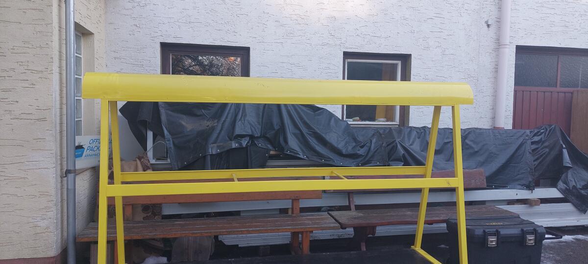 Transportwagen in Gelb, Schwarz, Länge ca. 2,50 m, Höhe ca. 168 cm, Breite ca. 80 cm und 2. Etage ca. 50 cm. Wurde für Aufbewahrung und Transport von Leder und Stoffe benutzt.