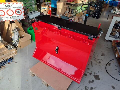 Verkaufe massive Forstkiste mit rund 350 kg aus 12 mm S355 Stahlblech gefertigt. Volumen ca. 230 l, riesiger Stauraum. Aufnahme KAT2 und Euro kombiniert. Verschluss