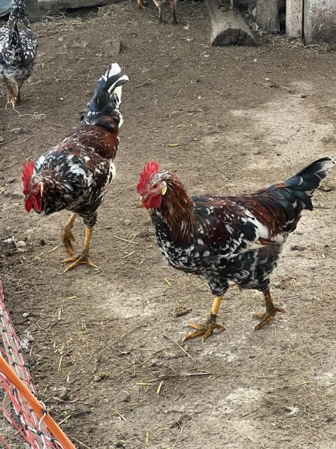 Zwei wunderschöne Junghähne suchen ein Zuhause mit vielen Hühnern, Rasse leider unbekannt. Kokoši Petlovi