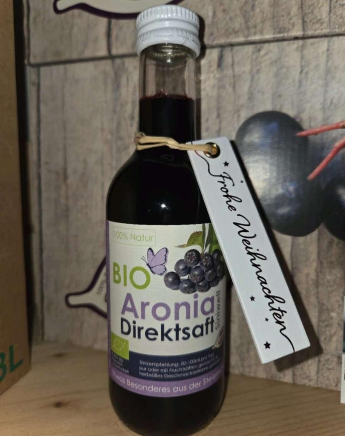 Verkaufe Bio Aronia Direktsaft in Flaschen abgefüllt, verschiedene Größen verfügbar: 0, 25 l Flasche um € 2, 50, -, 0, 75 l Flasche um € 5, 00, - und 1 l Flasche (inkl. Pf