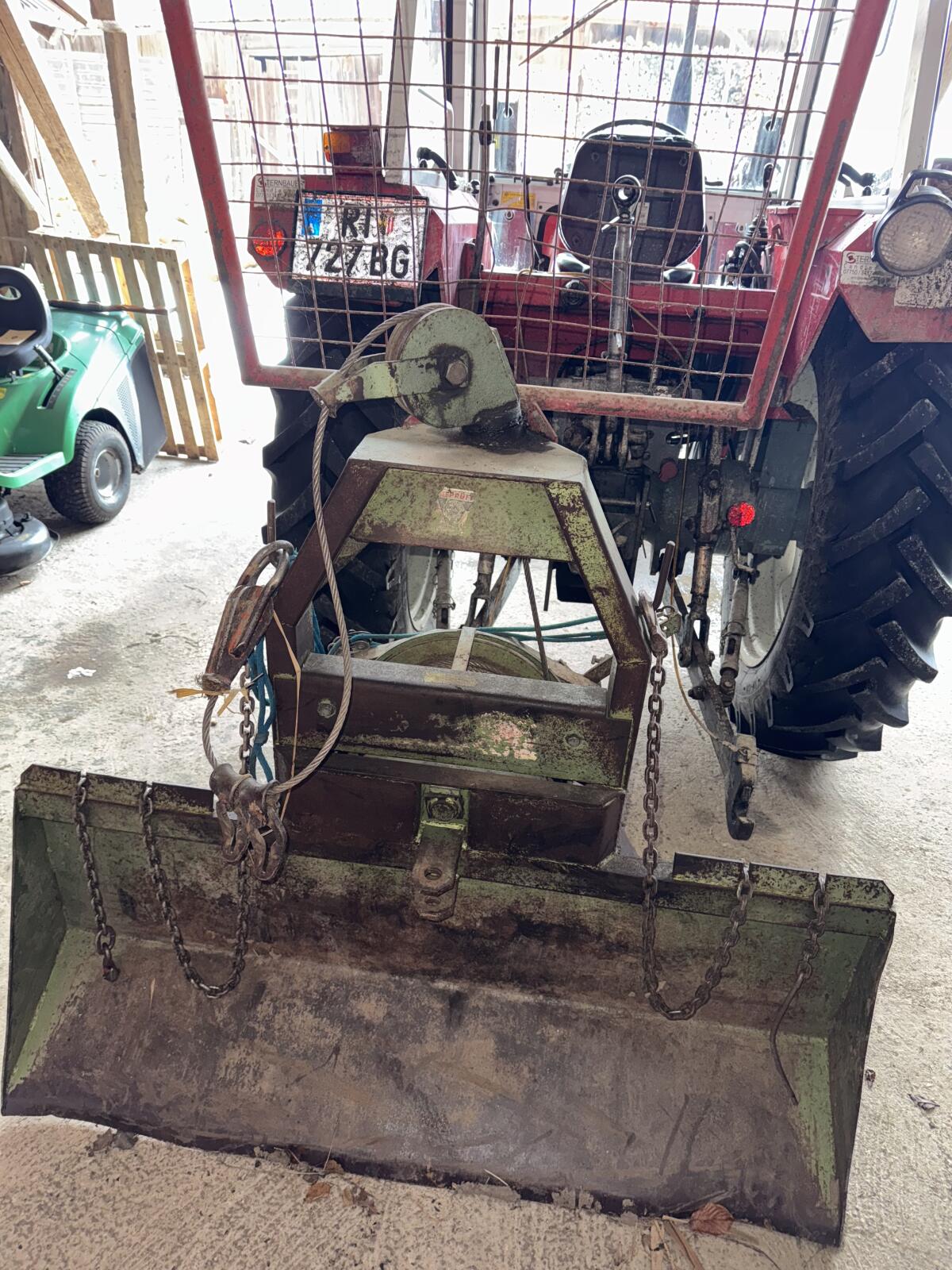 Ich finde kein Typenschild, Bj. unbekannt. Zugleistung zwischen 5 und 6 t, Schildbreite 150 cm. Seil usw. in gutem Zustand. Inkl. Gelenkwelle, Kugeln und zwei Ketten