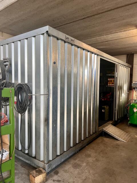 Zum Verkauf steht ein hochwertiger, feuerverzinkter SAFE TANK Container, ausgestattet mit einer integrierten Öl-Auffangwanne, Original steckbarem Regalsystem und ein