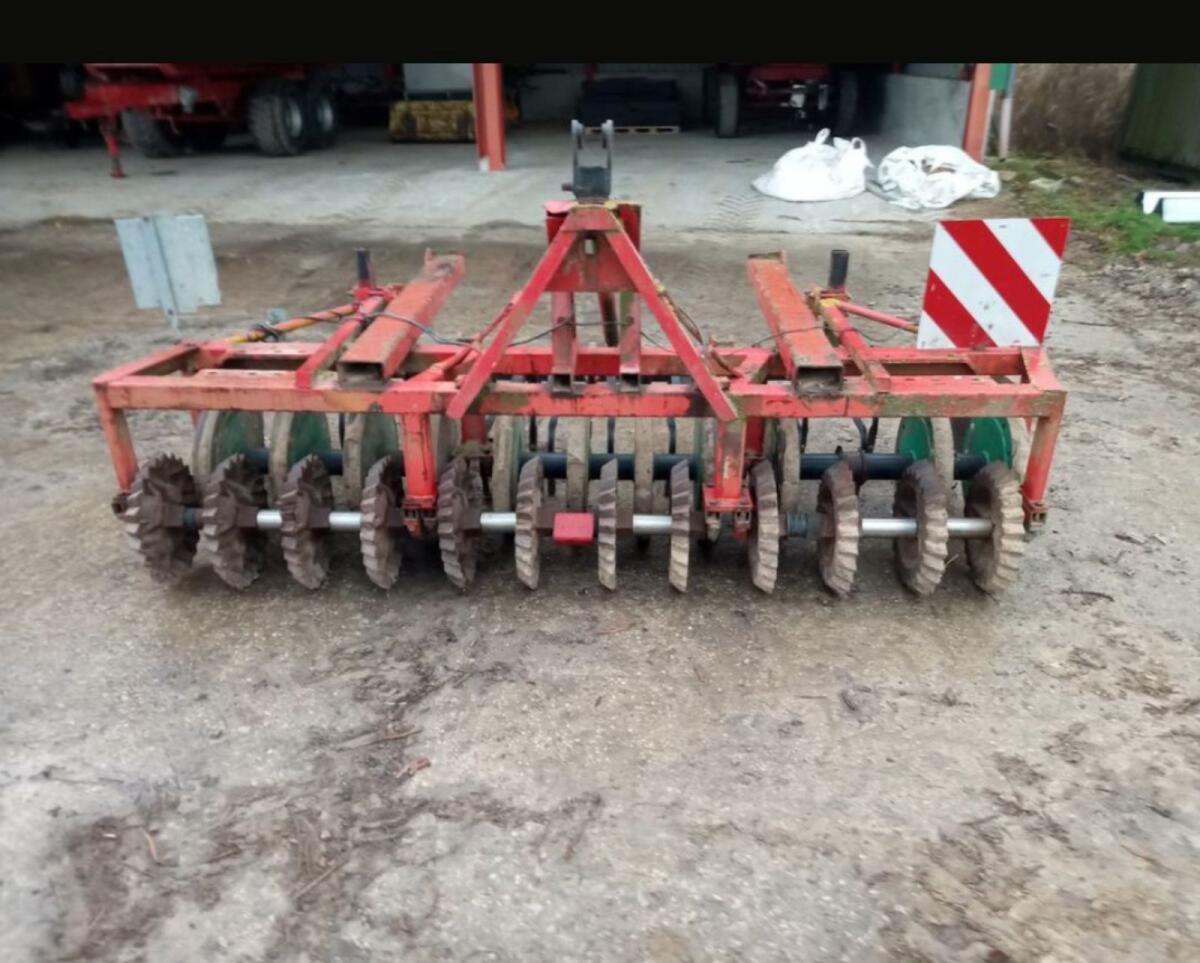 Die Scheibenegge hat eine AB von 4, 5 m und ist klappbar. 1 dw und 1 ew Stg. nötig. Arbeitstiefe und -Winkel einstellbar, 4-Rad-Fahrwerk, Scheibendurchmesser 620 mm.