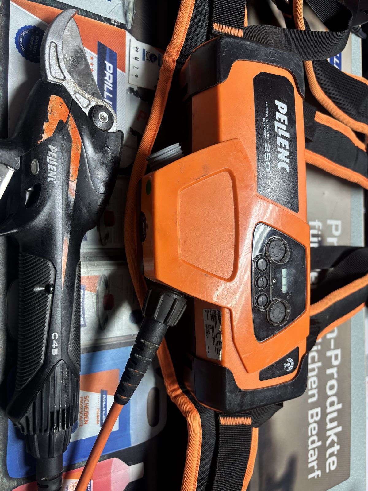Koffer mit Ladegerät Werkzeuggürtel BedienungsanleitungSchmierölSchneidezange und AkkuZusätzlicher Akku STK Preis incl. MWST € 114, --Erforderlich