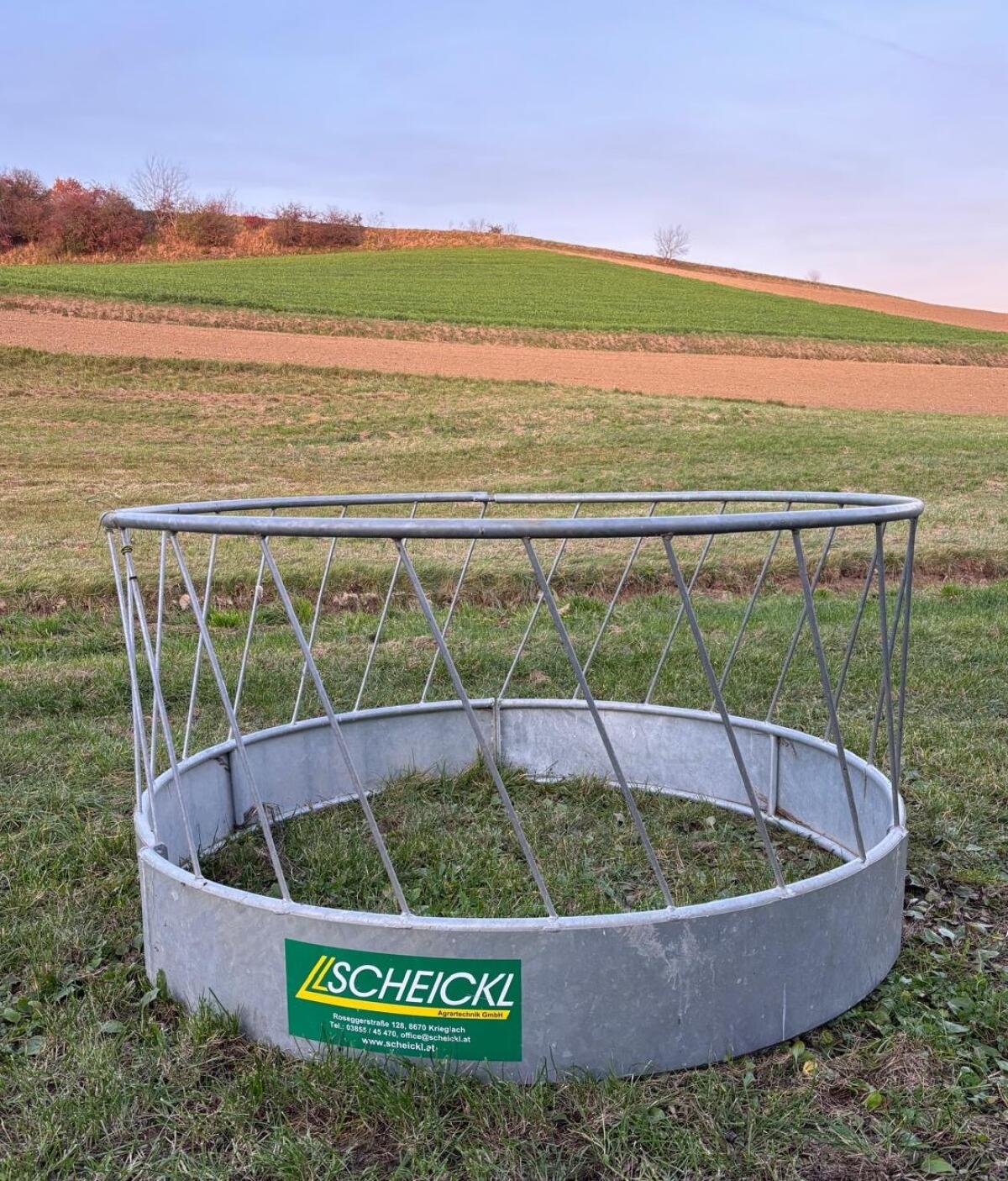 Feuerverzinkte Rundraufe ist für Rundballen bis 1, 40 m Durchmesser geeignet. Eigenschaften: Gesamthöhe: 0, 90 m, Rohrdurchmesser: 25 mm, Rahmen: 25 x 25 mm, Gewicht:
