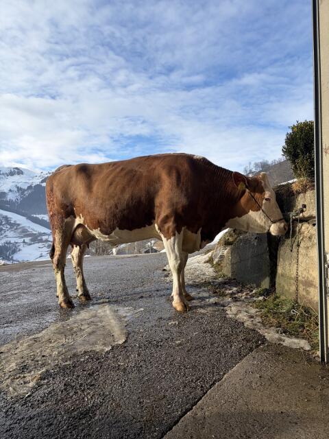 Verkaufe brave Brown Swiss Kühe in Milch wegen Überzahl, Laufstall, gealpt, 1x Jungkuh 24 kg Tagesgemelk, trächtig, s.k. 8.9.26, 1x Zweitkalbskuh, 28 kg Tagesgemelk,