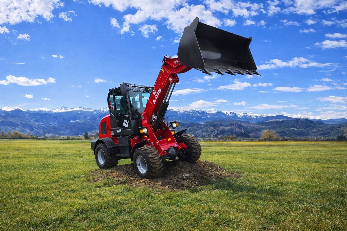 Wir verkaufen einen neuen Radlader der Marke Grizzly 810+T. Dieser Tele Lader ist ein universeller Helfer beim Bau, am Hof, im Stall bei Garten oder Landschaftsarbei