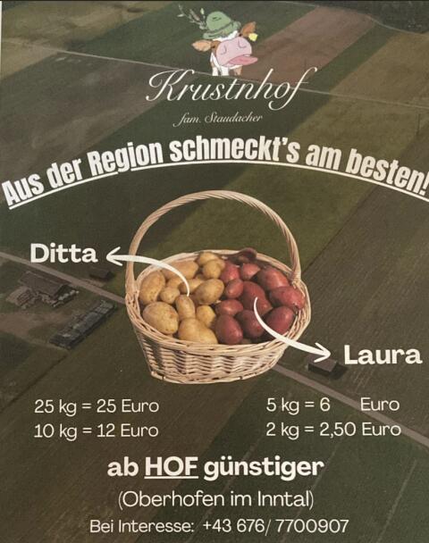 Bei uns am Krustnhof wachsen die Sorten Ditta & Laura mit eigenem Rindermist, ganz ohne Kunstdünger. So bekommen die Erdäpfel ihren besonders guten, echten Geschmack