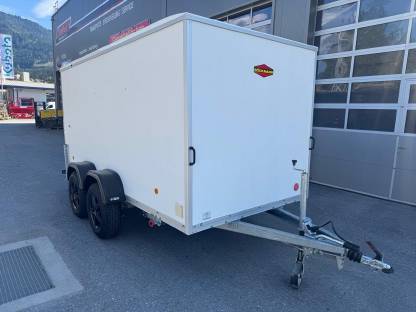 Böckmann Kofferanhänger KT 2513/75- 2 Querträger- Polyesterdeckel weiß- Stützrad mit Halterung- 4 Zurringe auf Boden montiert- Drehstangenverschluss- I