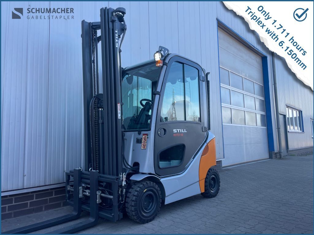 Bauart: Frontstapler / Treibgasstapler, Tragkraft: 1600kg, Hubhöhe: 6150mm, Bauhöhe: 2460mm, Freihub: 2360mm, Gabellänge: 1200mm, Bereifung vorne: Superelastik Einfa