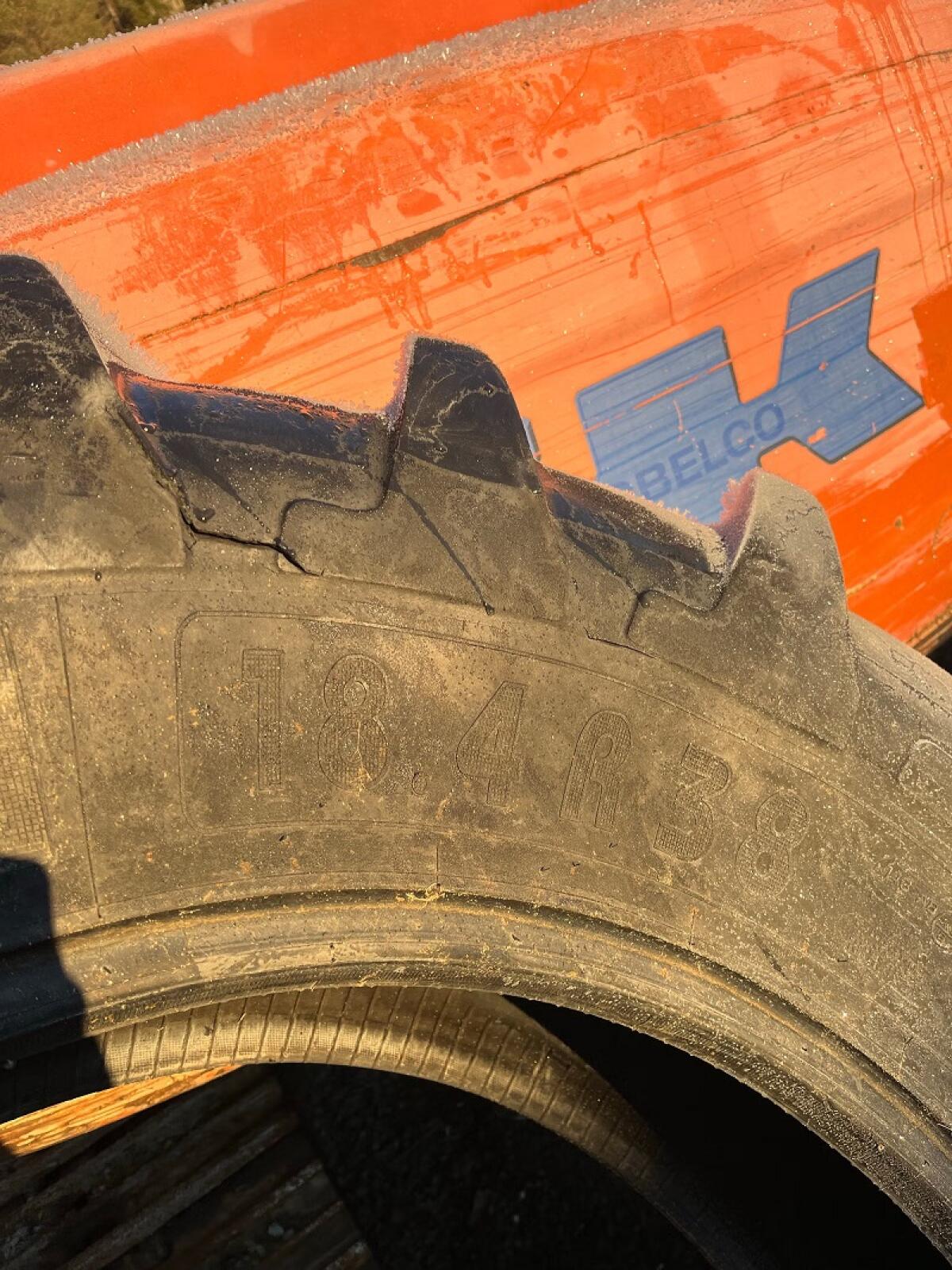 Angeboten wird ein einzelner Traktorreifen Michelin in der Größe 18.4-38. Der Reifen weist Risse und Alterserscheinungen auf, ist jedoch nicht vollständig durchgeris
