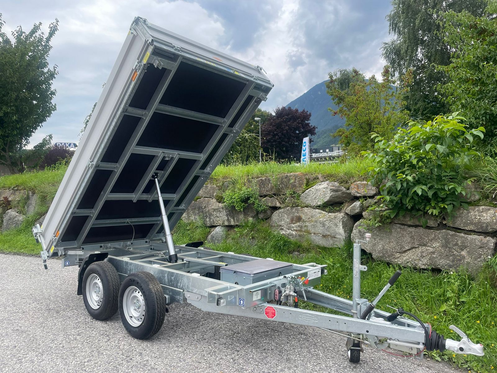 Dreiseitenkipper DK-AL 3218/35P Aufbau: Stahlblechboden, Stirnwand klappbar, Eckrungen herausnehmbar, 4 Zurrbügel in Seitenblende, Sicherheitsstütze, Bordwände