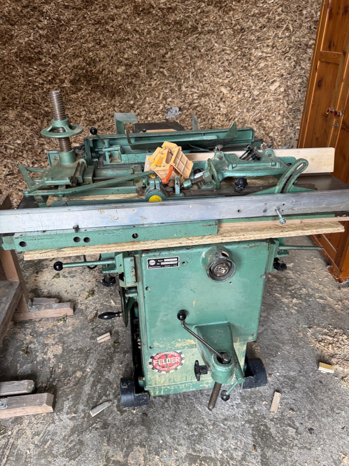 Eine Felder Kombigerät für Sägen, Hobeln (Hobelwelle mit 41 cm Breite) und Fräsen (Langbohren auch möglich). Alle Teile komplett vorhanden und soweit gut in Schuss.