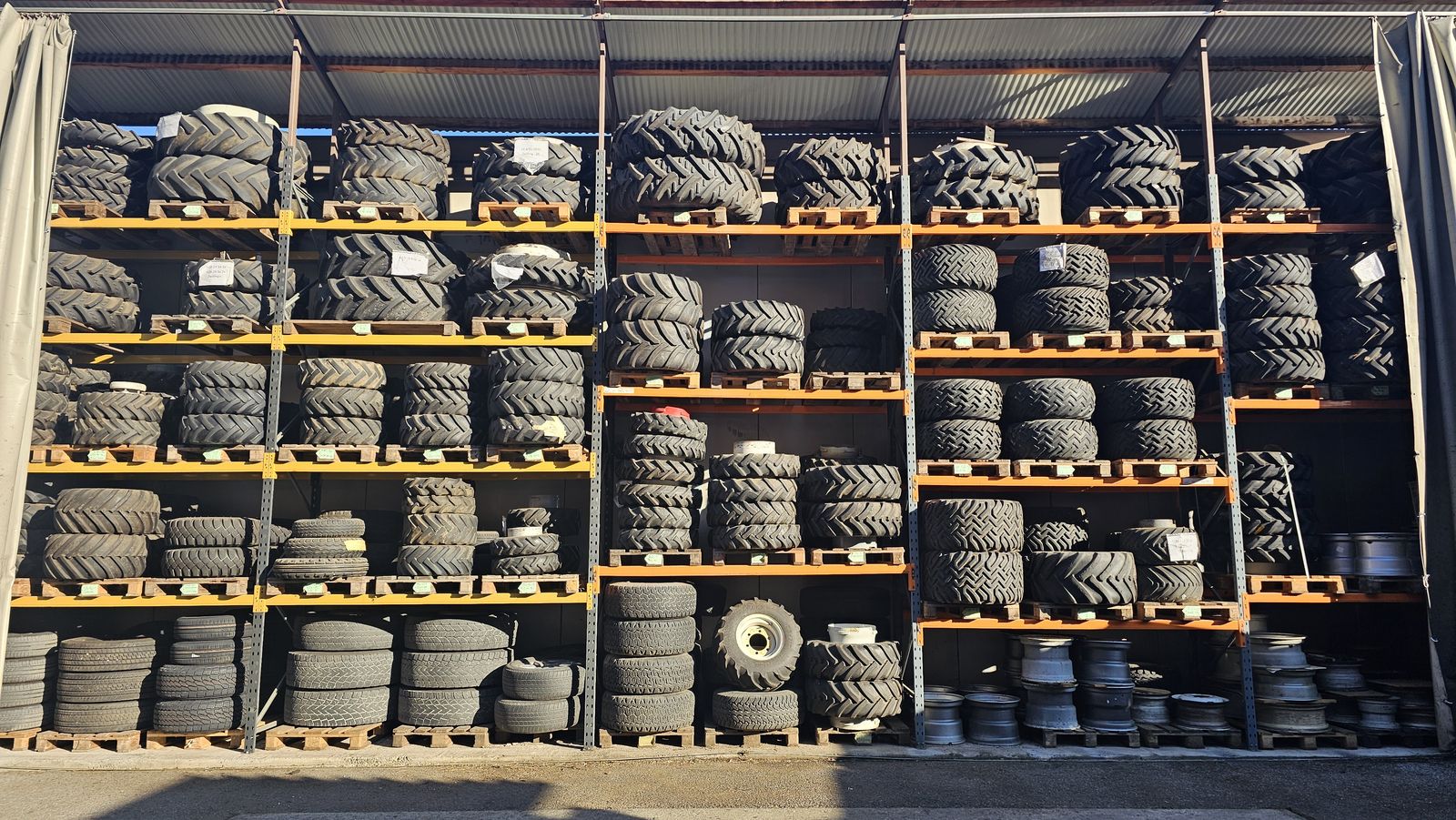 Kulturreifen, wie auf den Bildern ersichtlich, Vorderreifen ca. 15 %, Hinterreifen ca. 10 % Profil. Hinten 9, 5 R 44, Felgendurchmesser 116, 5 cm, Prägung W 8x44, vorn