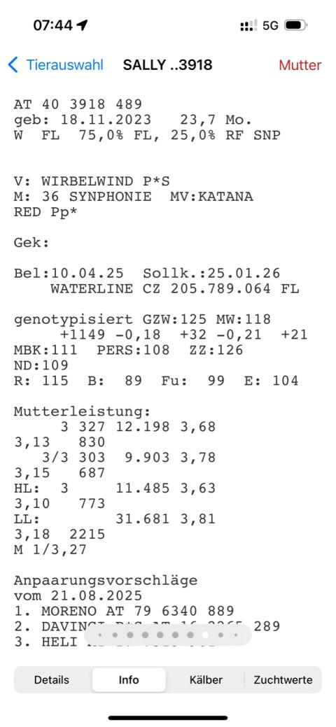 Verkaufe trächtige Bio-Kalbin, Mutter: Höchstleistung 11.500 l, eingestuft: 86 Fundament, 84 Euter. Super MBK, sehr niedrige Zellzahl 7-27. Belegt mit Waterline GZW