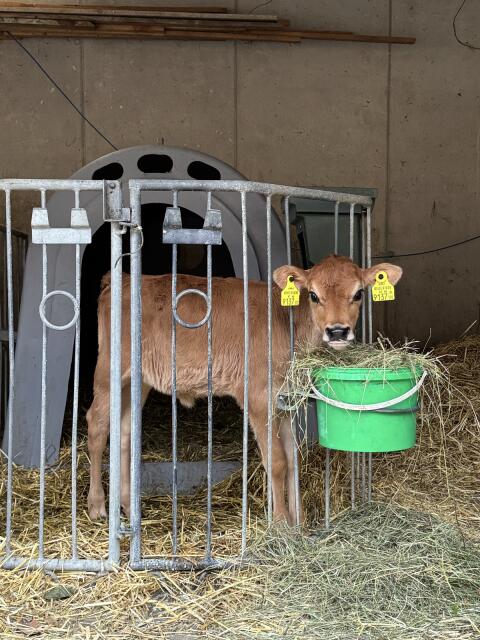 Verkaufe eine hornlose Jersey-Jungkuh aus einem Bio-Zuchtbetrieb. El.: 26 l, 4, 54 F% - 25 Zellzahl. Mutter (Bild 3 (kurz nach der Kalbung) / 4) mit VG85 eingestuft.