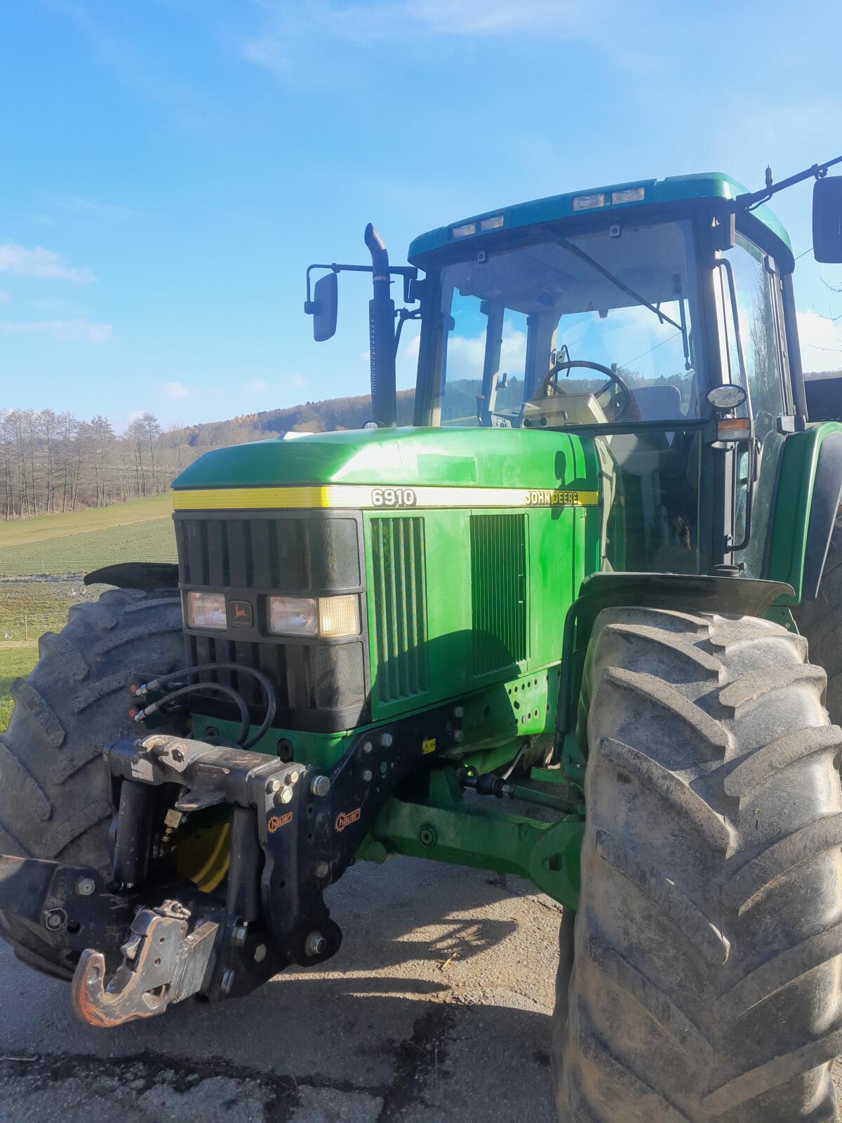 Verkaufe John Deere 6910, Erstanmeldung Nov. 1999, 7.737 Bstd., Hauer Fronthubwerk (abnehmbar), Druckluftanlage, 3 Zusatzstg., Bereifung vorne 540/65-28 ca. 30%, hin