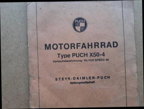 Angeboten wird ein Typenschein von einer Puch X50-4. Erstanmeldung 1980. Letzte Abmeldung war 1997. Zwei kleine unbedeutende Löcher im unteren Bereich. Die Papiere b
