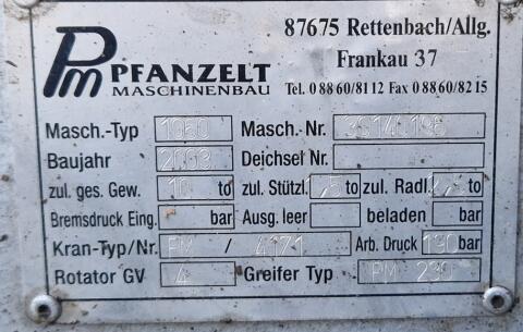 Pfanzelt Rückewagen 10 t, Bj. 2003, Eigenölversorgung, Reibrollenantrieb, Seilwinde mit Funk, 4 x DL und ölgebremst, Kran ca. 7 m, Joysticksteuerung, starke Astwanne